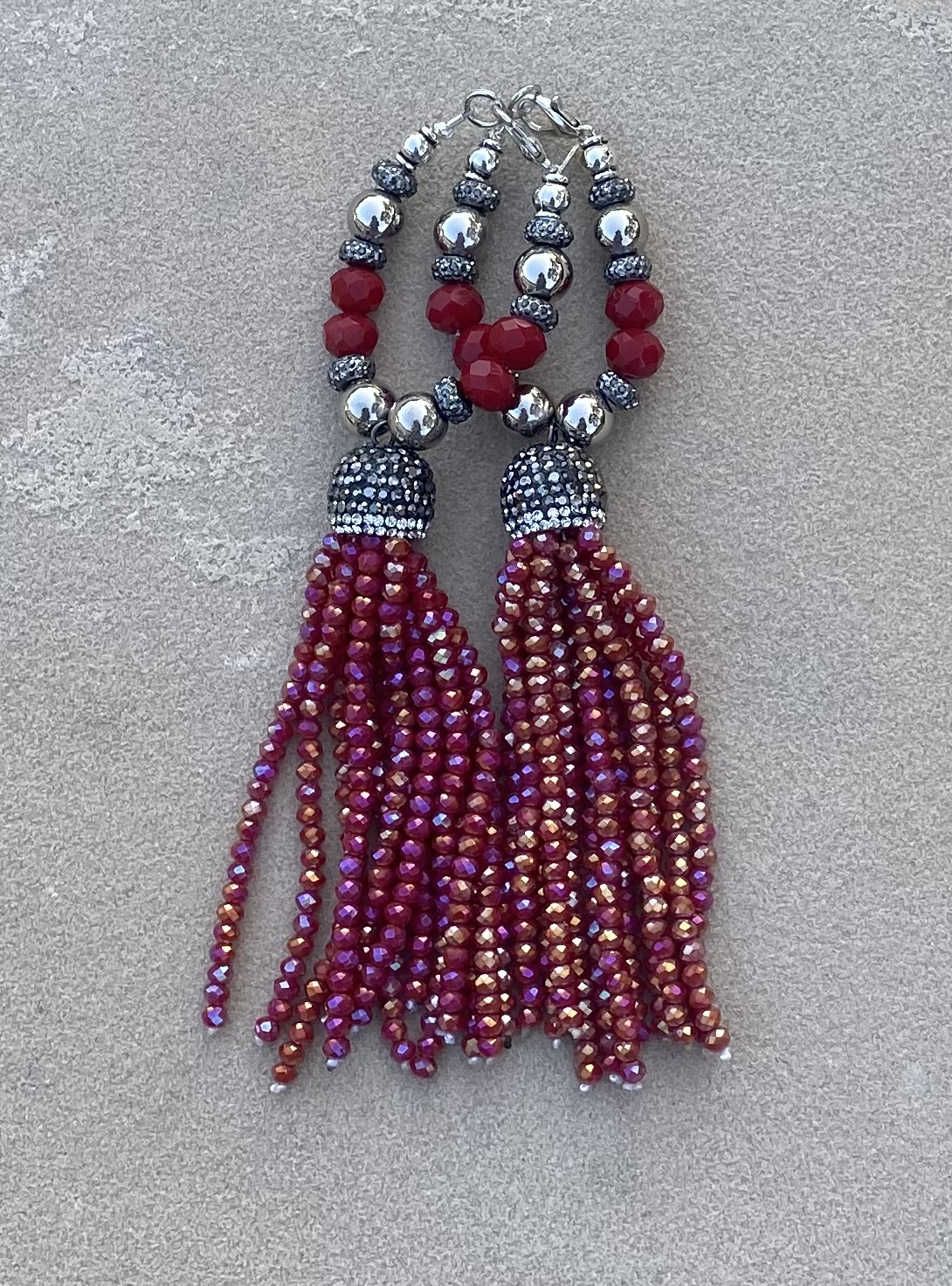 Stainless steel jewelry clasp, silver plated & red crystal beads, rondells, black & silver pava tassel cap with red crystal tassels. 5-6” Length